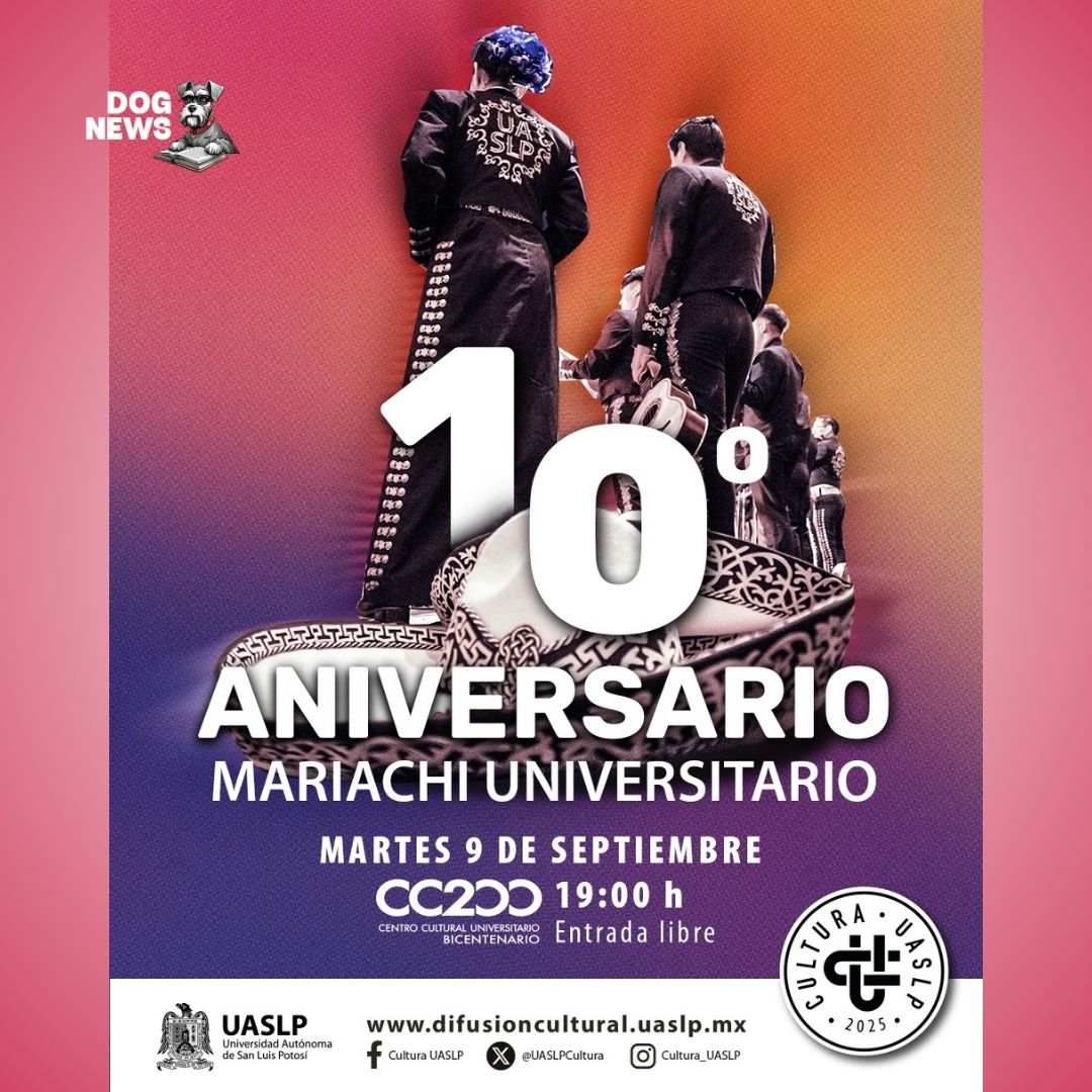La Universidad Autónoma de San Luis Potosí, a través de la Secretaría de Difusión Cultural, invita a la comunidad universitaria y al público en general a celebrar el décimo aniversario del Mariachi Universitario. Durante una década, este grupo ha llevado la música tradicional mexicana a escenarios locales, nacionales e internacionales, combinando talento, pasión y orgullo universitario.
