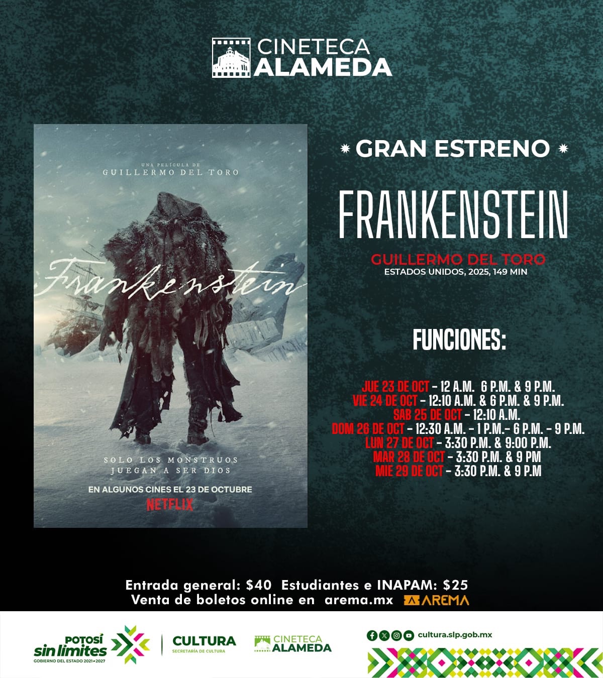 La Secretaría de Cultura de Gobierno del Estado invita a la población en general a disfrutar de manera exclusiva el estreno del más reciente filme del director mexicano Guillermo del Toro, “FRANKENSTEIN” (EUA, 2025), que llega a San Luis Potosí debido a la vinculación de Cineteca Alameda con Netflix y la distribuidora de cine independiente “Pimienta Films”.