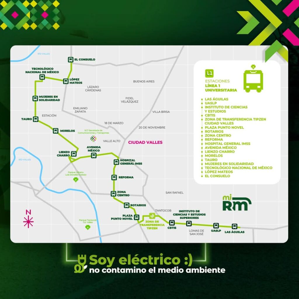 La Secretaría de Comunicaciones y Transportes (SCT) presentó en Ciudad Valles la Línea 1 Universitaria del nuevo sistema de transporte RedMetro, 100 % eléctrico, gratuito y sustentable. Este proyecto busca impulsar una movilidad eficiente en la región Huasteca, beneficiando directamente a más de 10 800 estudiantes de las principales instituciones educativas por donde pasará.